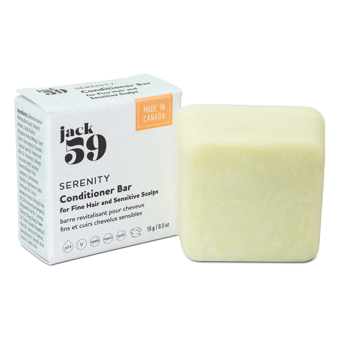 Calm and condition with Jack59's Serenity Conditioner Travel Buddies Singles. This gentle conditioner for itchy scalp soothes sensitivity while adding volume to fine hair with calming citrus and floral botanicals. Compact and lightweight, this travel size conditioner bar and hair conditioner bar is ideal for sensitive skin on the go or as a refill for your Weekend Edition Travel Set.